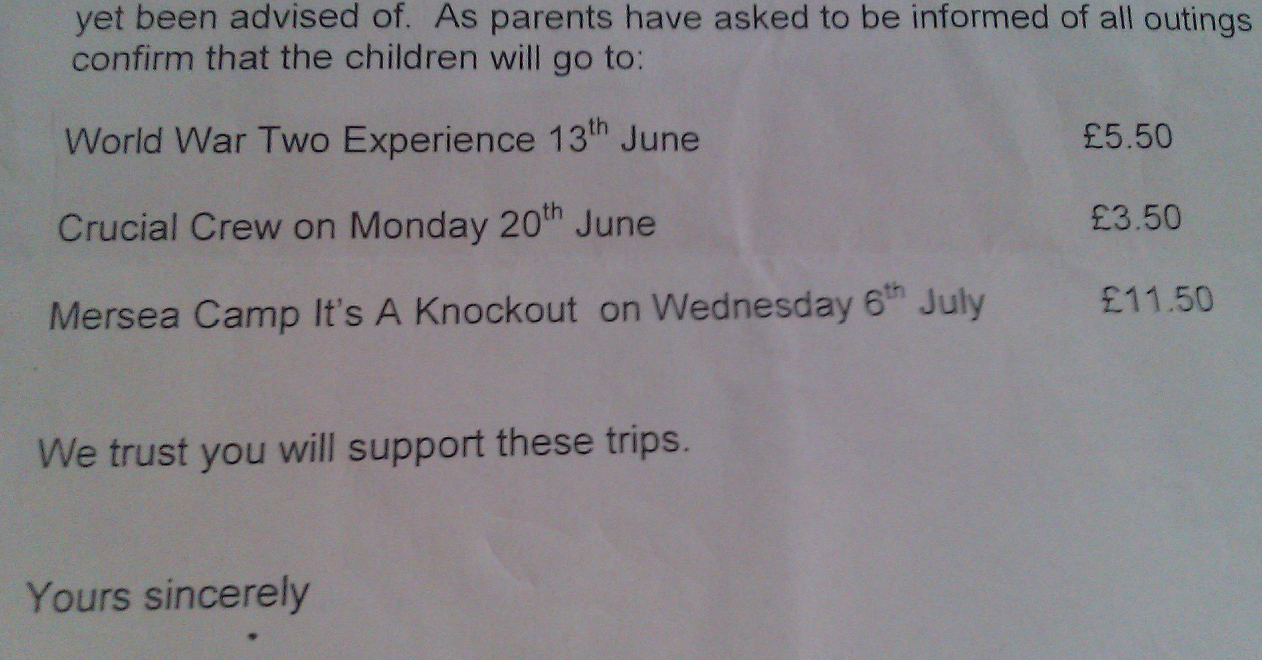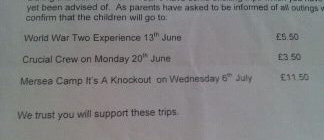 Essentially, this person, who was the secretary of the PTA, said that they NEVER paid for school trips and that payment was actually voluntary… According to them all school trips go ahead irrespective of payments received from parents.
