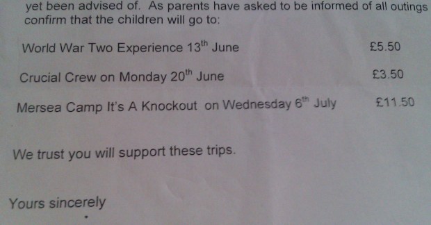 My question is – do you pay for school trips? Do you know someone who doesn’t – and if so do your/their children still get to go?