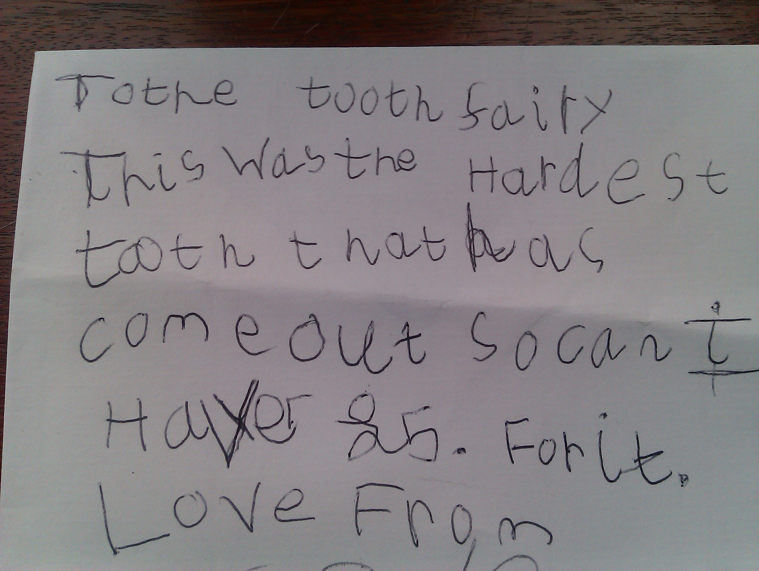 I was sorting through a box of stuff last week when I found a note from genius boy to the tooth fairy.