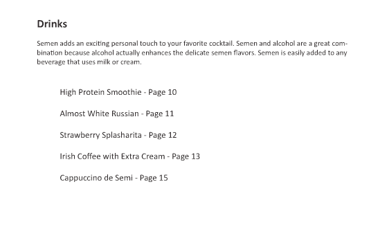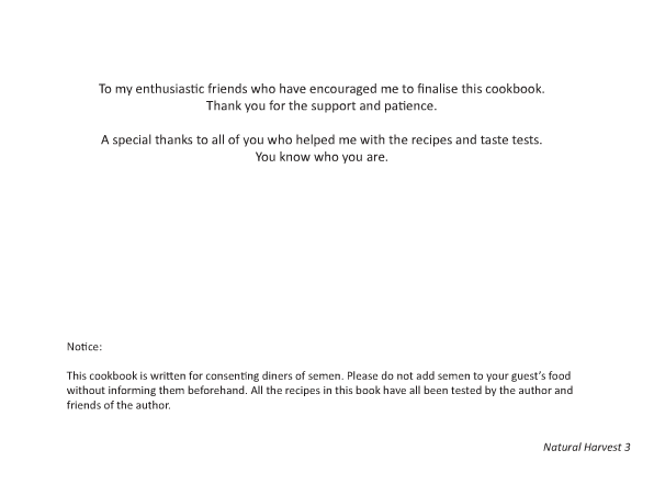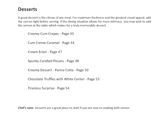 I love the little caveat at the bottom there! In case you can’t read it it says: ‘This cookbook is written for consenting diners of semen. Please do not add semen to your guest’s food without informing them beforehand. All the recipes in this book have all been tested by the author and friends of the author.