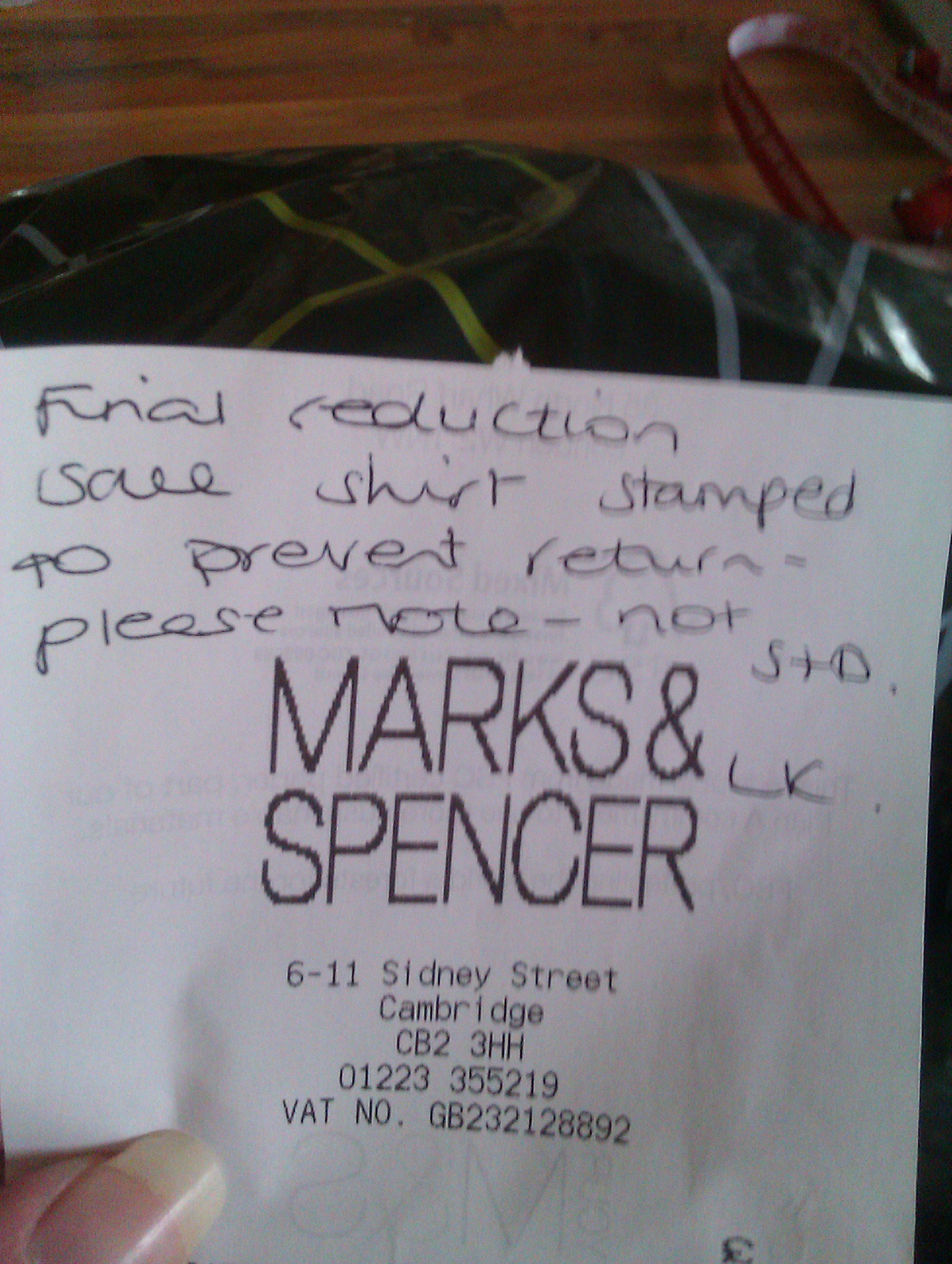 I pointed out that made no sense. Surely if it was a M&S decision then they would get a stamped made up that stated ‘non returnable’ or ‘final reduction’ – I cannot believe that a massive company like M&S would opt to instruct all of its staff to inaccurately mark clothing as soiled or damaged when it blatantly was not?