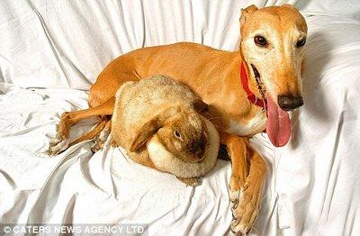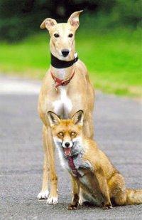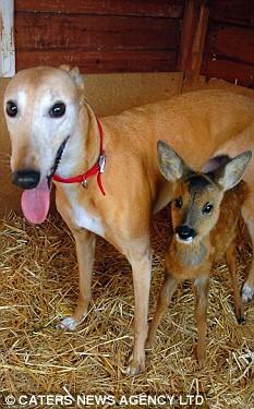 Jasmine, the timid, abused, deserted waif, became the animal sanctuary’s resident surrogate mother, a role for which she might have been born. The list of orphaned and abandoned youngsters she has cared for comprises five fox cubs, four badger cubs, fifteen chicks, eight guinea pigs, two stray puppies and fifteen rabbits – and one roe deer fawn. Tiny Bramble, eleven weeks old, was found semi-conscious in a field. Upon arrival at the sanctuary, Jasmine cuddled up to her to keep her warm, and then went into the full foster-mum role. Jasmine the greyhound showers Bramble the roe deer with affection, and makes sure nothing is matted.