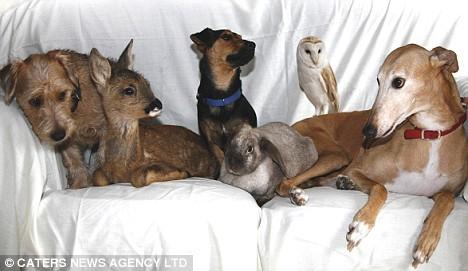 Pictured from the left are: “Toby”, a stray Lakeland dog; “Bramble”, orphaned roe deer; “Buster”, a stray Jack Russell; a dumped rabbit; “Sky”, an injured barn owl; and “Jasmine”, with a mother’s heart doing best what a caring mother would do….and such is the order of God’s Creation.