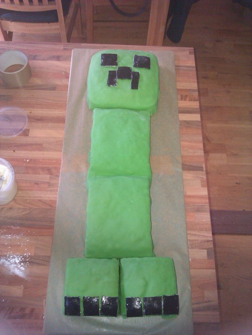 For Thing 2’s birthday this year I made a Creeper cake. Creeper, in case you don’t already know, is a character from a game called Minecraft. Thing 2 is completely obsessed with this game even though has hasn’t actually got it yet, so a Creeper cake was the obvious choice.
