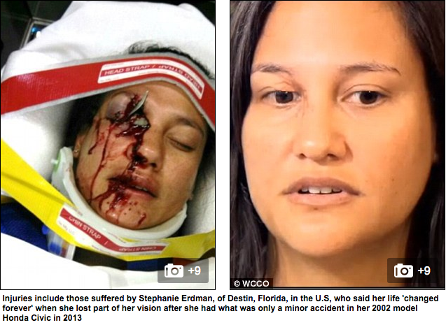 The image above shows the injuries endured by Stephanie Erdman, of Destin, Florida who said her life ‘changed forever’ when she lost part of her vision after she had an accident in her model Honda Civic in 2013.